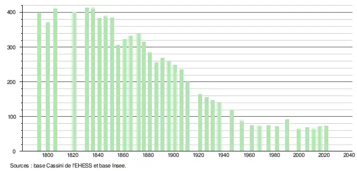 L'évolution du nombre d'habitants est connue à travers les recensements de la population effectués dans la commune depuis 1793. Pour les communes de moins de 10 000 habitants, une enquête de recensement portant sur toute la population est réalisée tous les cinq ans, les populations légales des années intermédiaires étant quant à elles estimées par interpolation ou extrapolation[18]. Pour la commune, le premier recensement exhaustif entrant dans le cadre du nouveau dispositif a été réalisé en 2006[19].