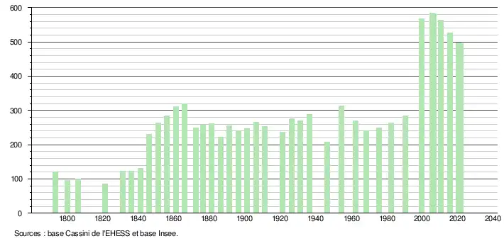 - Population municipale légale en vigueur au 1er janvier 2024, millésimée 2021, définie dans les limites territoriales en vigueur au 1er janvier 2023, date de référence statistique : 1er janvier 2021.
