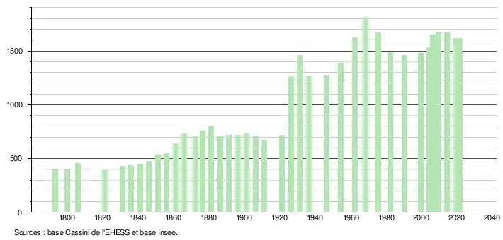 L'évolution du nombre d'habitants est connue à travers les recensements de la population effectués dans la commune depuis 1793. Pour les communes de moins de 10 000 habitants, une enquête de recensement portant sur toute la population est réalisée tous les cinq ans, les populations légales des années intermédiaires étant quant à elles estimées par interpolation ou extrapolation[23]. Pour la commune, le premier recensement exhaustif entrant dans le cadre du nouveau dispositif a été réalisé en 2004[24].