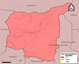 Le retrait-gonflement des sols argileux est susceptible d'engendrer des dommages importants aux bâtiments en cas d’alternance de périodes de sécheresse et de pluie. La totalité de la commune est en aléa moyen ou fort (94,5 % au niveau départemental et 48,5 % au niveau national). Sur les 344 bâtiments dénombrés sur la commune en 2019, 344 sont en aléa moyen ou fort, soit 100 %, à comparer aux 93 % au niveau départemental et 54 % au niveau national. Une cartographie de l'exposition du territoire national au retrait gonflement des sols argileux est disponible sur le site du BRGM[24],[Carte 3].