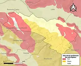 Le retrait-gonflement des sols argileux est susceptible d'engendrer des dommages importants aux bâtiments en cas d’alternance de périodes de sécheresse et de pluie[31]. 70,5 % de la superficie communale est en aléa moyen ou fort (59 % au niveau départemental et 48,5 % au niveau national)[Carte 5]. Depuis le , en application de la loi ELAN, différentes contraintes s'imposent aux vendeurs, maîtres d'ouvrages ou constructeurs de biens situés dans une zone classée en aléa moyen ou fort[Note 6],[32].