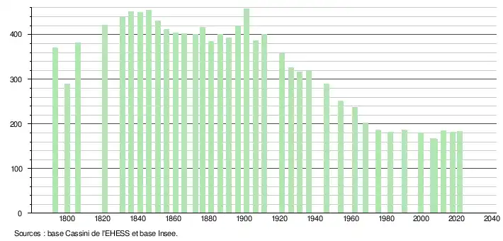 L'évolution du nombre d'habitants est connue à travers les recensements de la population effectués dans la commune depuis 1793. Pour les communes de moins de 10 000 habitants, une enquête de recensement portant sur toute la population est réalisée tous les cinq ans, les populations légales des années intermédiaires étant quant à elles estimées par interpolation ou extrapolation[37]. Pour la commune, le premier recensement exhaustif entrant dans le cadre du nouveau dispositif a été réalisé en 2007[38].
