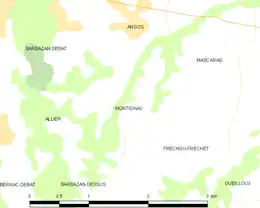 La commune de Montignac située sur le 2°10 de longitude Ouest et 43°environ de latitude Nord est limitée au Nord par la commune d’Angos, à l’Est par les communes de Mascaras et de Fréchou, au Sud par la commune de Barbazan-Dessus et à l’Ouest par celle d’ Allier et d’Angos.