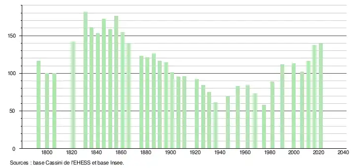 | L'évolution du nombre d'habitants est connue à travers les recensements de la population effectués dans la commune depuis 1793. Pour les communes de moins de 10 000 habitants, une enquête de recensement portant sur toute la population est réalisée tous les cinq ans, les populations légales des années intermédiaires étant quant à elles estimées par interpolation ou extrapolation[26]. Pour la commune, le premier recensement exhaustif entrant dans le cadre du nouveau dispositif a été réalisé en 2006[27]. En 2021, la commune comptait 139 habitants[Note 4], en augmentation de 8,59 % par rapport à 2015 (Hautes-Pyrénées : +1,04 %, France hors Mayotte : +1,84 %). |