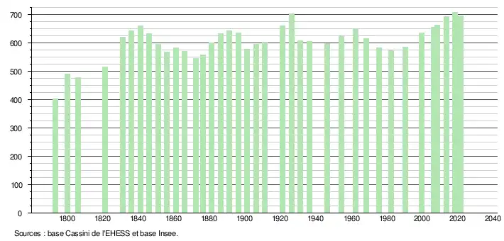 L'évolution du nombre d'habitants est connue à travers les recensements de la population effectués dans la commune depuis 1793. Pour les communes de moins de 10 000 habitants, une enquête de recensement portant sur toute la population est réalisée tous les cinq ans, les populations légales des années intermédiaires étant quant à elles estimées par interpolation ou extrapolation[20]. Pour la commune, le premier recensement exhaustif entrant dans le cadre du nouveau dispositif a été réalisé en 2008[21].