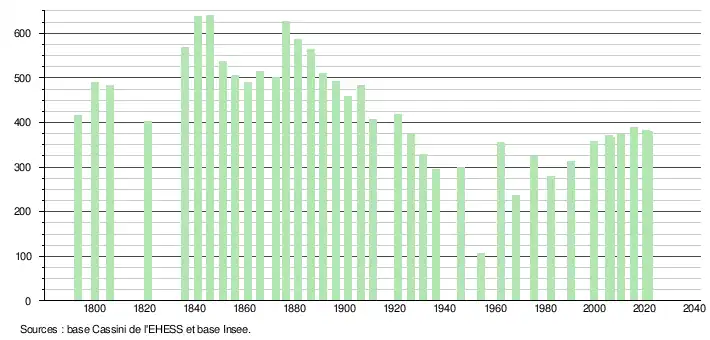 L'évolution du nombre d'habitants est connue à travers les recensements de la population effectués dans la commune depuis 1793. Pour les communes de moins de 10 000 habitants, une enquête de recensement portant sur toute la population est réalisée tous les cinq ans, les populations légales des années intermédiaires étant quant à elles estimées par interpolation ou extrapolation[13]. Pour la commune, le premier recensement exhaustif entrant dans le cadre du nouveau dispositif a été réalisé en 2005[14].