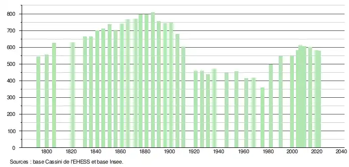 L'évolution du nombre d'habitants est connue à travers les recensements de la population effectués dans la commune depuis 1793. Pour les communes de moins de 10 000 habitants, une enquête de recensement portant sur toute la population est réalisée tous les cinq ans, les populations légales des années intermédiaires étant quant à elles estimées par interpolation ou extrapolation[17]. Pour la commune, le premier recensement exhaustif entrant dans le cadre du nouveau dispositif a été réalisé en 2004[18].