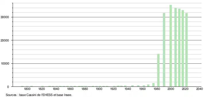 - Par convention dans Wikipédia, le principe a été retenu de n’afficher dans le tableau des recensements et le graphique, pour les populations légales postérieures à 1999, que les populations correspondant à une enquête exhaustive de recensement pour les communes de moins de 10 000 habitants, et que les populations des années 2006, 2011, 2016, etc. pour les communes de plus de 10 000 habitants, ainsi que la dernière population légale publiée par l’Insee pour l'ensemble des communes.