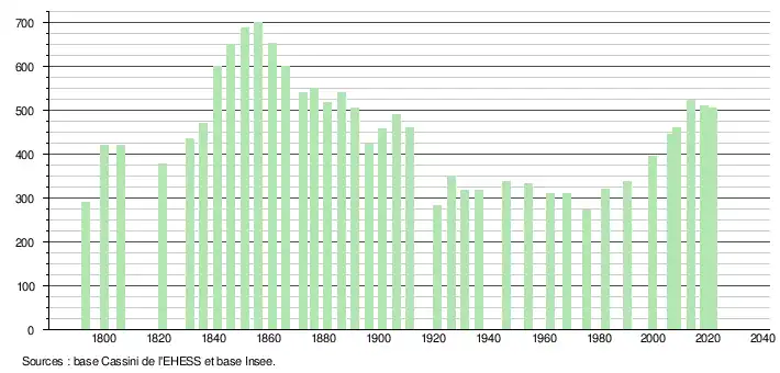 L'évolution du nombre d'habitants est connue à travers les recensements de la population effectués dans la commune depuis 1793. Pour les communes de moins de 10 000 habitants, une enquête de recensement portant sur toute la population est réalisée tous les cinq ans, les populations légales des années intermédiaires étant quant à elles estimées par interpolation ou extrapolation[21]. Pour la commune, le premier recensement exhaustif entrant dans le cadre du nouveau dispositif a été réalisé en 2008[22].