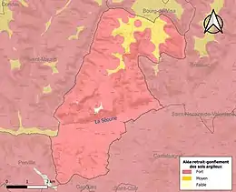 Le retrait-gonflement des sols argileux est susceptible d'engendrer des dommages importants aux bâtiments en cas d’alternance de périodes de sécheresse et de pluie. 99,7 % de la superficie communale est en aléa moyen ou fort (92 % au niveau départemental et 48,5 % au niveau national). Sur les 155 bâtiments dénombrés sur la commune en 2019, 152 sont en aléa moyen ou fort, soit 98 %, à comparer aux 96 % au niveau départemental et 54 % au niveau national. Une cartographie de l'exposition du territoire national au retrait gonflement des sols argileux est disponible sur le site du BRGM[26],[Carte 3].