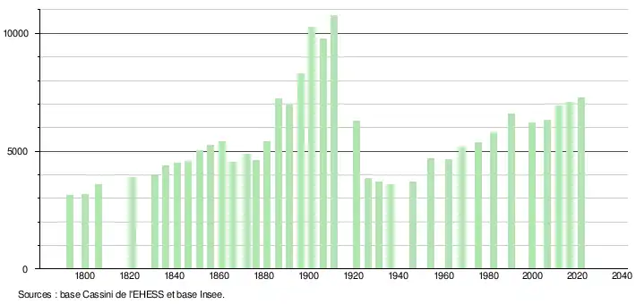 L'évolution du nombre d'habitants est connue à travers les recensements de la population effectués dans la commune depuis 1793. Pour les communes de moins de 10 000 habitants, une enquête de recensement portant sur toute la population est réalisée tous les cinq ans, les populations légales des années intermédiaires étant quant à elles estimées par interpolation ou extrapolation[39]. Pour la commune, le premier recensement exhaustif entrant dans le cadre du nouveau dispositif a été réalisé en 2006[40].