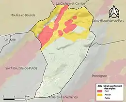 La commune est vulnérable au risque de mouvements de terrains constitué principalement du retrait-gonflement des sols argileux[23]. Cet aléa est susceptible d'engendrer des dommages importants aux bâtiments en cas d’alternance de périodes de sécheresse et de pluie. 42,2 % de la superficie communale est en aléa moyen ou fort (59,3 % au niveau départemental et 48,5 % au niveau national). Sur les 74 bâtiments dénombrés sur la commune en 2019, 68 sont en aléa moyen ou fort, soit 92 %, à comparer aux 85 % au niveau départemental et 54 % au niveau national. Une cartographie de l'exposition du territoire national au retrait gonflement des sols argileux est disponible sur le site du BRGM[24],[Carte 2].