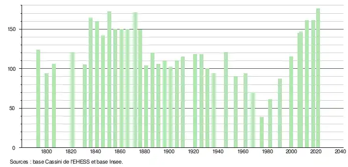 L'évolution du nombre d'habitants est connue à travers les recensements de la population effectués dans la commune depuis 1793. Pour les communes de moins de 10 000 habitants, une enquête de recensement portant sur toute la population est réalisée tous les cinq ans, les populations légales des années intermédiaires étant quant à elles estimées par interpolation ou extrapolation[30]. Pour la commune, le premier recensement exhaustif entrant dans le cadre du nouveau dispositif a été réalisé en 2007[31].