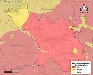Le retrait-gonflement des sols argileux est susceptible d'engendrer des dommages importants aux bâtiments en cas d’alternance de périodes de sécheresse et de pluie[21]. La totalité de la commune est en aléa moyen ou fort (91,8 % au niveau départemental et 48,5 % au niveau national)[Carte 2]. Depuis le , en application de la loi ELAN, différentes contraintes s'imposent aux vendeurs, maîtres d'ouvrages ou constructeurs de biens situés dans une zone classée en aléa moyen ou fort[Note 3],[22].