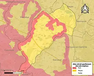 Le retrait-gonflement des sols argileux est susceptible d'engendrer des dommages importants aux bâtiments en cas d’alternance de périodes de sécheresse et de pluie[23]. La totalité de la commune est en aléa moyen ou fort (91,8 % au niveau départemental et 48,5 % au niveau national)[Carte 2]. Depuis le , en application de la loi ELAN, différentes contraintes s'imposent aux vendeurs, maîtres d'ouvrages ou constructeurs de biens situés dans une zone classée en aléa moyen ou fort[Note 4],[24].