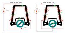 La variante à bobine fixe est commercialisée en 1958 par Lip, avec le calibre R27. L'une des premières montres équipées de ce mouvement est offerte au général de Gaulle[10]. Le schéma à la droite présente les deux étapes du fonctionnement du balancier du mouvement R27. Dans le dessin de gauche, le circuit électrique est ouvert, et le balancier suit son mouvement, entraîné par le ressort spiral (non représenté). Dans le dessin de droite, pour une certaine position du balancier, la plaquette solidaire du balancier a déformé le fil de contact, fermant le circuit. Les deux bobines agissent alors comme des électroaimants. L'ensemble formé par le cœur magnétique et le balancier forment alors un circuit magnétique, et un couple est exercé sur le balancier, car il tend à se placer horizontalement pour maximiser le flux magnétique. Une diode permet d'éviter une décharge électrique trop violente lorsque le circuit se rouvre, l'inductance créant alors une surtension[11].