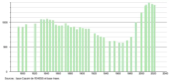 L'évolution du nombre d'habitants est connue à travers les recensements de la population effectués dans la commune depuis 1793. Pour les communes de moins de 10 000 habitants, une enquête de recensement portant sur toute la population est réalisée tous les cinq ans, les populations légales des années intermédiaires étant quant à elles estimées par interpolation ou extrapolation[21]. Pour la commune, le premier recensement exhaustif entrant dans le cadre du nouveau dispositif a été réalisé en 2007[22].