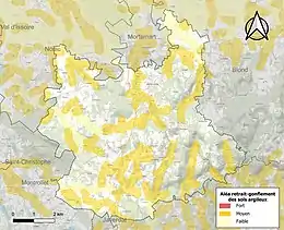 Le retrait-gonflement des sols argileux est susceptible d'engendrer des dommages importants aux bâtiments en cas d’alternance de périodes de sécheresse et de pluie[17]. 33,6 % de la superficie communale est en aléa moyen ou fort (27 % au niveau départemental et 48,5 % au niveau national métropolitain)[Carte 2]. Depuis le , en application de la loi ÉLAN, différentes contraintes s'imposent aux vendeurs, maîtres d'ouvrages ou constructeurs de biens situés dans une zone classée en aléa moyen ou fort[Note 3],[18].