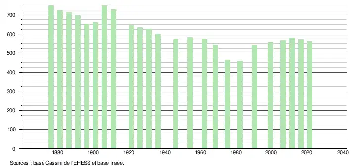 L'évolution du nombre d'habitants est connue à travers les recensements de la population effectués dans la commune depuis 1876. Pour les communes de moins de 10 000 habitants, une enquête de recensement portant sur toute la population est réalisée tous les cinq ans, les populations légales des années intermédiaires étant quant à elles estimées par interpolation ou extrapolation[25]. Pour la commune, le premier recensement exhaustif entrant dans le cadre du nouveau dispositif a été réalisé en 2006[26].