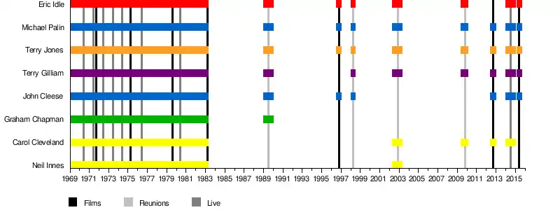Deux des six Python — Cleese, le créateur du spectacle[14] et Jones — ont travaillé (comme interprète, auteur ou directeur) dans les quatre représentations, Palin dans trois, Chapman dans deux et Gilliam dans un seul. Eric Idle n'a participé à aucun des spectacles.