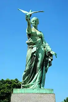 La partie centrale du mémorial est constitué d'un soubassement en pierre bleue, d'un piédestal en granit et d'une statue en bronze représentant « la Patrie reconnaissante et dépoitraillée »[3] brandissant un pigeon de la main droite et tenant une palme dans la main gauche[1].