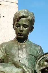 Sous le médaillon se dresse une statue de bronze de Godefroid Devreese représentant le plus ancien ouvrier et le plus jeune apprenti des usines en 1910[2].