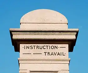 Le sommet du monument arbore la mention « Instruction - Travail », par laquelle on le désigne parfois.