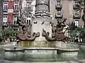 Sur la fontaine a été érigée une colonne de fer de 18 mètres de hauteur, supposée comme étant le premier usage de ce matériau à des fins ornementales dans la ville[3]. Pour parachever la colonne il a été souhaité une statue consacrée à un personnage éminent de l'histoire maritime de la ville, comme Christophe Colomb ou Blasco de Garay. C'est finalement Galceran Marquet (1366-1410) qui a été choisi, qui avait été selon l'historien Antoni de Bofarull le vice-amiral de la flotte catalane qui avait lutté contre la République de Gênes en 1331. La fontaine a été inaugurée le 29 juin 1851[4].