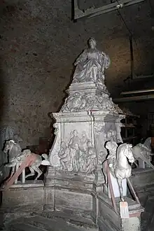 Sur chacun des quatre côtés de la base se trouve un champ voûté avec un relief et devant lui une statue autoportante dans un contexte thématique :