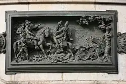 Le piédestal de pierre est ceint de douze hauts-reliefs en bronze, œuvres de Léopold Morice[6], reliés par des rosaces, disposés à la hauteur du regard des passants. Ils constituent une chronologie d'événements marquant l'histoire de la République française, entre 1789 et 1880 :