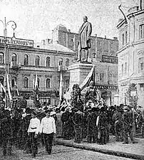 Dans le cadre de la préparation de la Journée de la liberté (uk), le (calendrier julien), le , une manifestation ukrainienne de masse a eu lieu à Kiev sur Krechtchatyk. Le point culminant de cette action fut quand la foule révolutionnaire ukrainienne organisa un « tribunal du peuple » jugeant Piotr Stolypine. Une potence improvisée fut construite autour du monument. Après les discours des « avocats » et des « accusateurs », le « verdict » fut lu, après quoi la figure de Stolypine à l’aide de treuils métalliques a d’abord été suspendue au-dessus du piédestal, puis, sous les cris enthousiastes de la foule, jetée au sol.