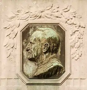 Ce groupe en bronze est porté par un piédestal en pierre de taille assemblée en grand appareil orné d'un médaillon représentant le portrait de profil du général, entouré d'une guirlande de laurier, à gauche, et d'une guirlande de chêne, à droite, symboles du mérite.