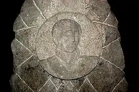 La face tournée vers le nord-ouest arbore un médaillon sculpté, également en pierre bleue, orné d'un portrait du général, surmonté d'un aigle.