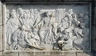 - un soubassement carré situé pour sa plus grande partie sous le niveau de la place, dont les quatre faces sont ornées de bas-reliefs en marbre représentant des scènes de la révolution belge[2] :