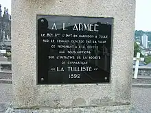 Ce monument en forme d’obélisque porte à sa base une plaque refaite récemment et qui porte l’inscription suivante : « À L’ARMÉE / LE 80e RENT D’INFIE EN GARNISON À TULLE / SUR LE TERRAIN CONCÉDÉ PAR LA VILLE / CE MONUMENT A ÉTÉ OFFERT / PAR SOUSCRIPTIONS / SUR L’INITIATIVE DE LA SOCIÉTÉ / DE GYMNASTIQUE / « LA TULLISTE » / 1892 ».