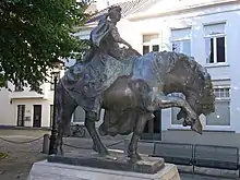 Sur la face avant du socle, on voit Robert II d'Artois, petit-fils du roi français Louis VIII et gouverneur de Flandre, gisant sous son cheval après avoir été désarçonné par Willem van Saeftinghe. Au dessus de lui sont sculptés les blasons de la Flandre Occidentale et de la ville de Courtrai.