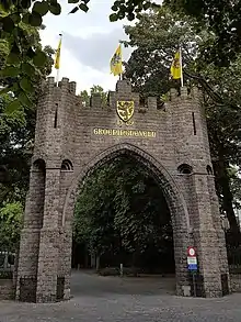 Après la construction du monument, le comité national de Groeninghe disposait encore d'un surplus financier de 6000 Fb. La porte de Groeninghe, un arc de triomphe qui commémore également la victoire lors de la bataille des Éperons d'or, a été conçu avec ce surplus d'argent. Réalisée par l'architecte Brugeois Jos Viérin pour un coût total de 14 700 Fb, elle a été offerte à la ville de Courtrai le [14].