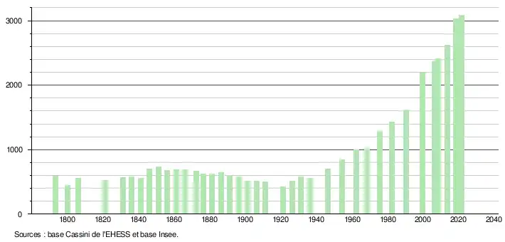 L'évolution du nombre d'habitants est connue à travers les recensements de la population effectués dans la commune depuis 1793. Pour les communes de moins de 10 000 habitants, une enquête de recensement portant sur toute la population est réalisée tous les cinq ans, les populations légales des années intermédiaires étant quant à elles estimées par interpolation ou extrapolation[13]. Pour la commune, le premier recensement exhaustif entrant dans le cadre du nouveau dispositif a été réalisé en 2008[14].
