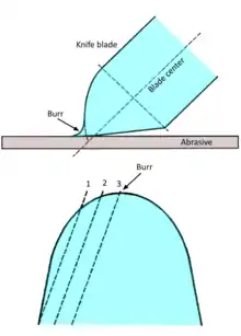 Quand l'autre face de la lame sera affûtée, le morfil repasse logiquement du côté opposé et ainsi de suite[8]. Au fur et à mesure que le morfil passe d'un côté à l'autre, il devient friable et finit par casser.
