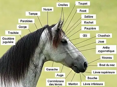 - Partie latérale : parotide, tempe, rochet, salière, cils, œil, paupière, joue, apophyse ou arête zygomatique (os permettant au cavalier d'empoigner aisément la tête du cheval), naseau.
