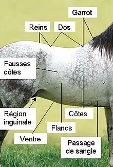 - du garrot, du dos, des reins, du poitrail, des ars, des inter-ars, des côtes, du passage de sangle, des flancs, du ventre, de la région inguinale, de l'anus, du périnée, du couard, et de la queue ;