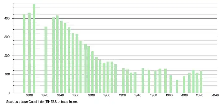 L'évolution du nombre d'habitants est connue à travers les recensements de la population effectués dans la commune depuis 1793. Pour les communes de moins de 10 000 habitants, une enquête de recensement portant sur toute la population est réalisée tous les cinq ans, les populations légales des années intermédiaires étant quant à elles estimées par interpolation ou extrapolation[21]. Pour la commune, le premier recensement exhaustif entrant dans le cadre du nouveau dispositif a été réalisé en 2006[22].