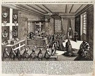 Au lendemain du décès, dans la chambre du roi, le corps est transporté dans l’antichambre de l’Œil-de-bœuf du château de Versailles pour être autopsié[Note 3], triparti (séparation du corps, du cœur et des entrailles) puis embaumé avant d’être enfermé dans un double cercueil, de plomb et de chêne[10]. Le troisième jour, le cercueil est exposé pour une semaine dans une pièce plus grande, le salon de Mercure du Grand Appartement pour y recevoir les honneurs[10].