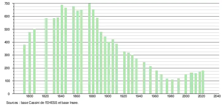 L'évolution du nombre d'habitants est connue à travers les recensements de la population effectués dans la commune depuis 1793. Pour les communes de moins de 10 000 habitants, une enquête de recensement portant sur toute la population est réalisée tous les cinq ans, les populations légales des années intermédiaires étant quant à elles estimées par interpolation ou extrapolation[20]. Pour la commune, le premier recensement exhaustif entrant dans le cadre du nouveau dispositif a été réalisé en 2007[21].