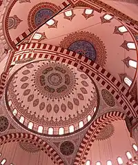 La salle de prière possède un plan carré. Elle est couronnée d'une coupole centrale flanquée de quatre demi-couples. La coupole principale, dont le diamètre est de 19 mètres et qui culmine à 37 mètres de hauteur, est soutenue par quatre piliers. C'est la première fois que l'architecte utilise la technique consistant à masquer les contreforts extérieurs par des galeries à colonnades sur toute la longueur des façades nord et sud.