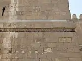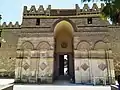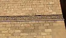 Le mur extérieur du bastion sud présente une inscription en coufique feuillagé, sculptée dans le marbre, de la période fatimide[1],[2]. Le bord haut de la partie inférieure de ce bastion présente également des créneaux ornés conçus selon un motif entrelacé qui ressemble aux créneaux trouvés dans l'ancienne mosquée Ibn Tulun[6]. Le minaret nord a ensuite été incorporé dans les murs de la ville par Badr al-Jamali en 1087, date à laquelle l'inscription coufique sur son bastion enveloppant a été soit déplacée, soit regravée à l'extérieur des murs de la ville[21].