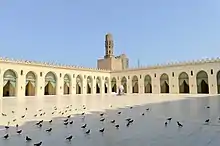 La mosquée se trouvait à l'origine à l'extérieur des murs du Caire, mais lorsque le vizir fatimide Badr al-Jamali reconstruisit et agrandit les murs de la ville en 1087, le côté nord de la mosquée, y compris son minaret, fut incorporé dans le mur nord de la ville (entre les portes récemment construites de Bab al-Futuh et Bab al-Nasr )[1],[11]. Une ziyada, ou une enceinte extérieure fortifiée, fut également ajoutée plus tard autour de la mosquée, commencée par le calife al-Zahir (c.1021-1036 ) mais achevée beaucoup plus tard, sous le sultan ayyoubide al-Salih Najm al-Din (r. 1240-1036). 1249) et le sultan mamelouk Aybak (r. 1250-1257)[12].