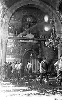 En 1969, Denis Michael Rohan (en), un fondamentaliste chrétien australien, déclaré a posteriori malade mental et atteint du syndrome de Jérusalem, met volontairement le feu au minbar datant du xiie siècle[49]. Des pompiers de Jérusalem-Ouest arrivent sur les lieux, rejoints par des pompiers arabes de Ramallah, Hébron et Naplouse[50]. Une foule arabe agressent alors les pompiers israéliens[51]. Le meuble est entièrement détruit à l'exception de quelques morceaux qui ont pu être sauvés et se trouvent aujourd'hui au musée islamique de Jérusalem[réf. nécessaire].