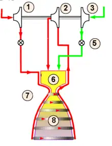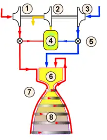 - le système d'alimentation en ergols du moteur-fusée : le choix de ce système a un impact direct sur les performances et joue un rôle majeur dans l'architecture générale du moteur. Il peut se résumer à un simple système de mise sous pression des réservoirs mais inclut souvent des turbopompes, un générateur de gaz, etc.