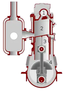 Le cycle commence avec le piston en bas de sa course. En montant, il aspire de l'air dans le carter par l'orifice d'admission. En même temps, du carburant est pulvérisé dans le vaporisateur. La charge d'air « au-dessus » du piston est comprimée dans le vaporisateur, où elle est mélangée avec le carburant atomisé et s'enflamme. Le piston est entraîné dans le cylindre. En descendant, le piston découvre d'abord l'orifice d'échappement. Les gaz d'échappement sous pression sortent du cylindre. Une fraction après la découverte de l'orifice d'échappement, le piston descendant découvre l'orifice de transfert. Le piston met maintenant sous pression l'air dans le carter, qui est forcé à travers l'orifice de transfert et dans l'espace au-dessus du piston. Une partie de la charge d'air entrant est perdue par l'orifice d'échappement encore ouvert pour s'assurer que tous les gaz d'échappement sont évacués du cylindre, un processus connu sous le nom de « balayage ». Le piston atteint alors le bas de sa course et recommence à monter, aspirant une nouvelle charge d'air dans le carter et complétant le cycle. L'admission et la compression sont effectuées sur la course ascendante, tandis que la puissance (la détente) et l'échappement se produisent sur la course descendante.